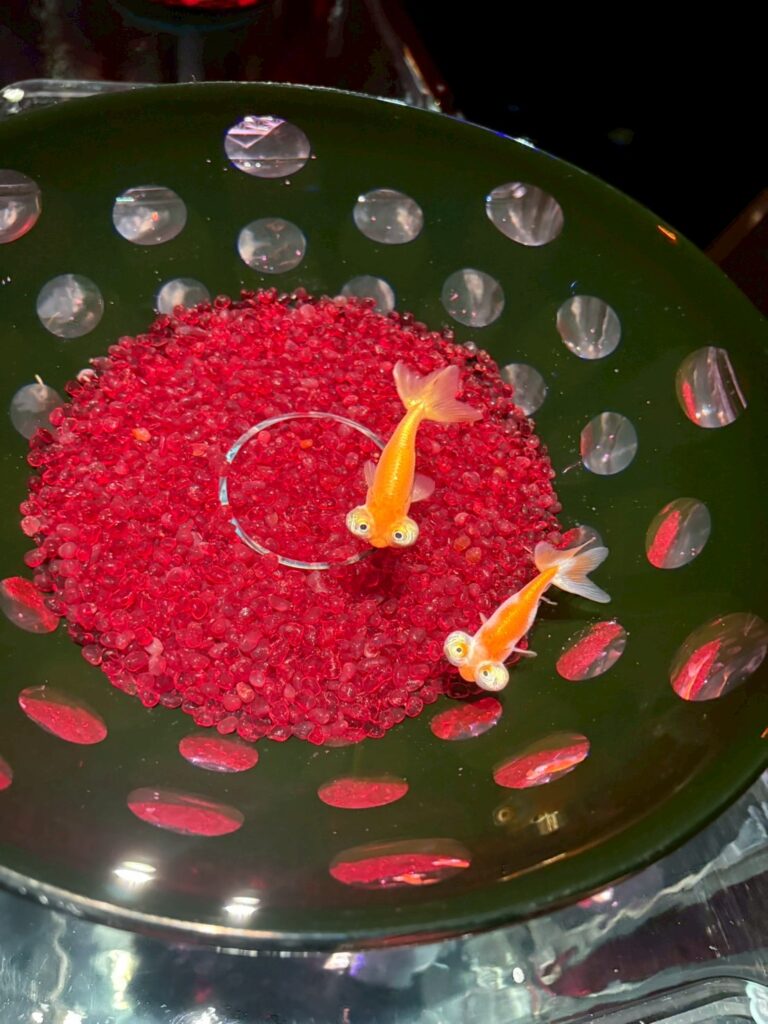 江戸時代から続く金魚観賞という文化を芸術作品として、水や光、音、香りと連携し、美しい1つの作品を創り上げたものです。